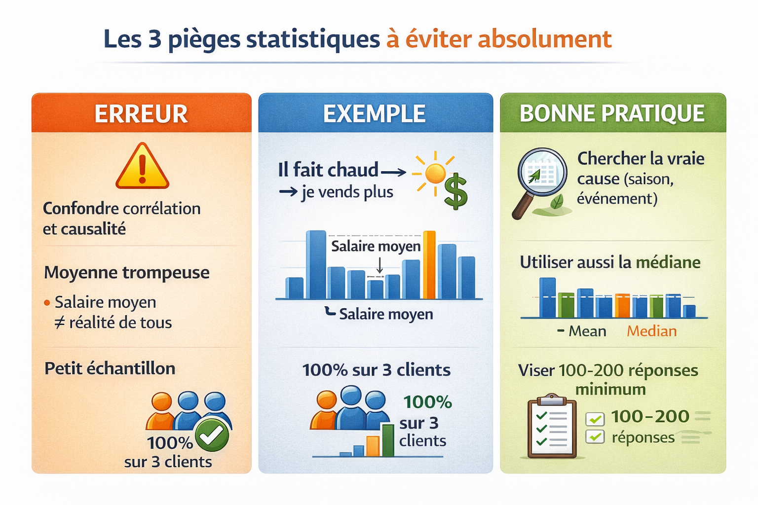 - Évitez les 3 pièges : corrélation ≠ causalité, moyenne trompeuse, échantillon trop petit